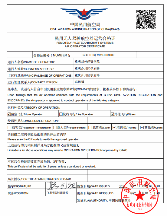 未来,基地将充分发挥学校学科优势、人才优势、平台优势、资源优势,致力于超大城市数字化治理,不断聚拢行业资源、强化合作交流,努力打造渝西片区具有特色的、集无人机行业应用服务、无人机起降场、职业技能培训与认证、社会咨询等多功能于一体的低空经济行业应用飞行基地,服务重庆“低空经济创新发展之城”建设。