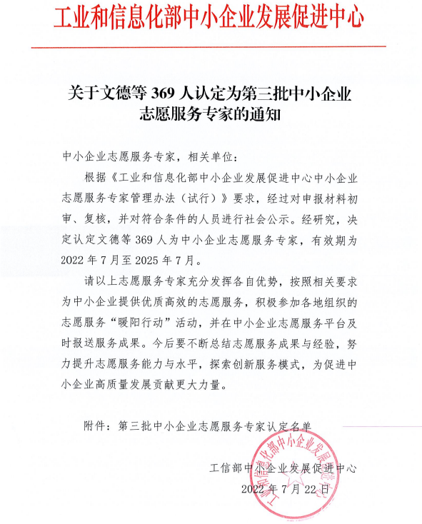 工信部中小企业服务中心官网公示:关于第三批中小企业志愿服务专家和工作站名单的公示_中国中小企业发展促进中心 (chinasme.org.cn)