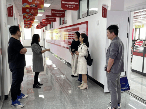 【本网讯】4月16日,重庆康刻尔制药股份有限公司与重庆恒誉康医药科技有限公司代表一行到访我校京东数字经贸产业学院,实地参观京东数字经贸产业学院建设情况。跨境商务学院副院长李艳全程陪同参观,并主持召开座谈会,双方就共建“实践教学基地”达成初步合作意向,计划择日正式签约。