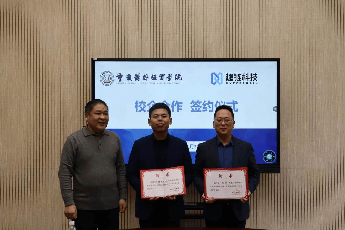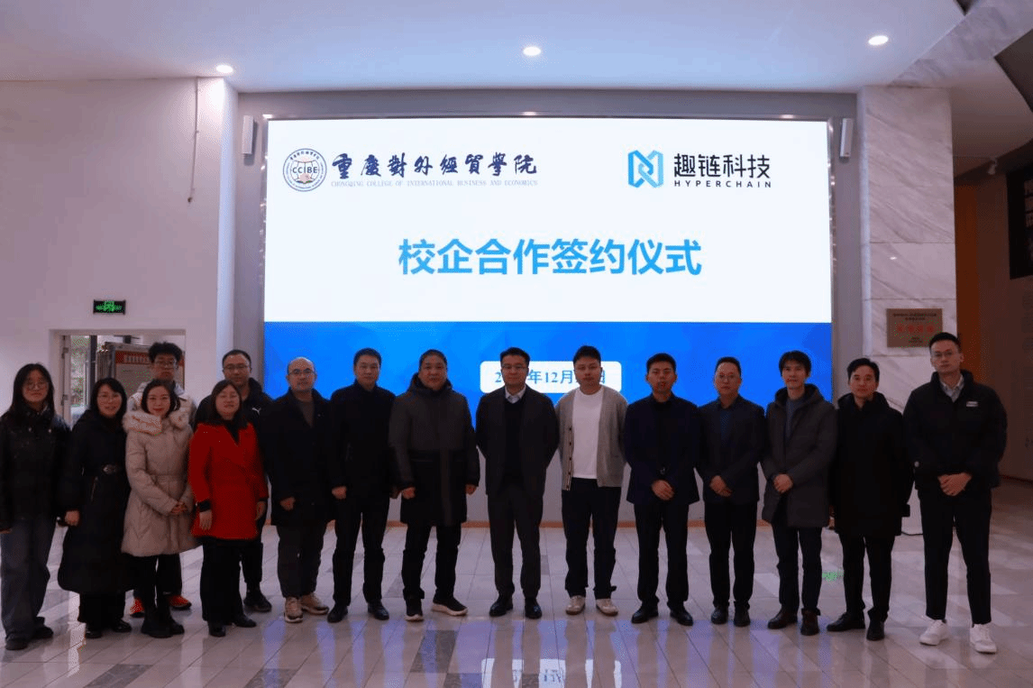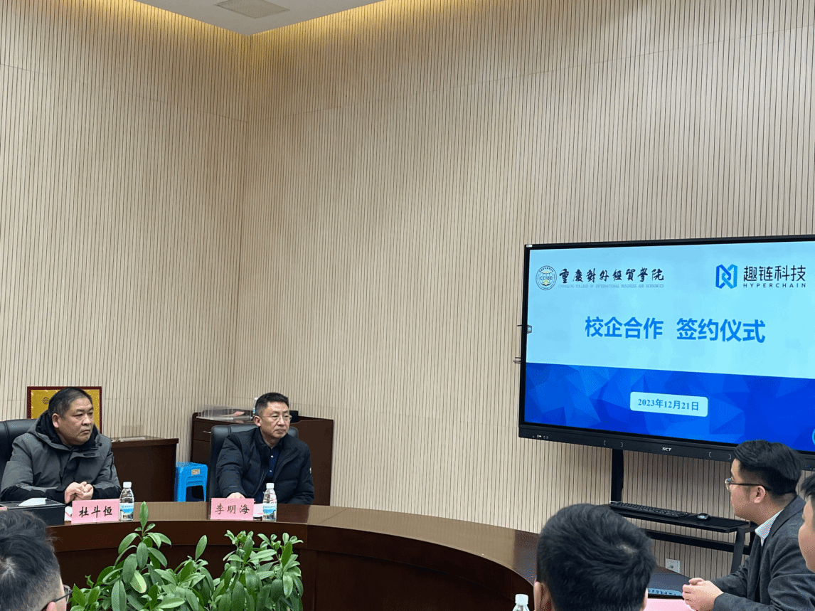 为深化产教融合、校企合作,推动学校专业建设及人才培养模式改革,促进区块链工程专业教育的整体发展和提高。2023年12月21日下午,重庆对外经贸学院与杭州趣链科技有限公司在合川A校区9104会议室举行了校企合作签约仪式。重庆对外经贸学院校长李明海、副校长杜斗恒、数学与计算机学院院长陈东升、教务处副处长彭高中、数学与计算机学院党总支书记尹翔、数学与计算机学院副院长马秀芬以及杭州趣链科技有限公司创始人兼高级副总裁匡立中、重庆趣链科技副总经理唐瑞琮 、教育事业部总监郭彦之等参加签约仪式。