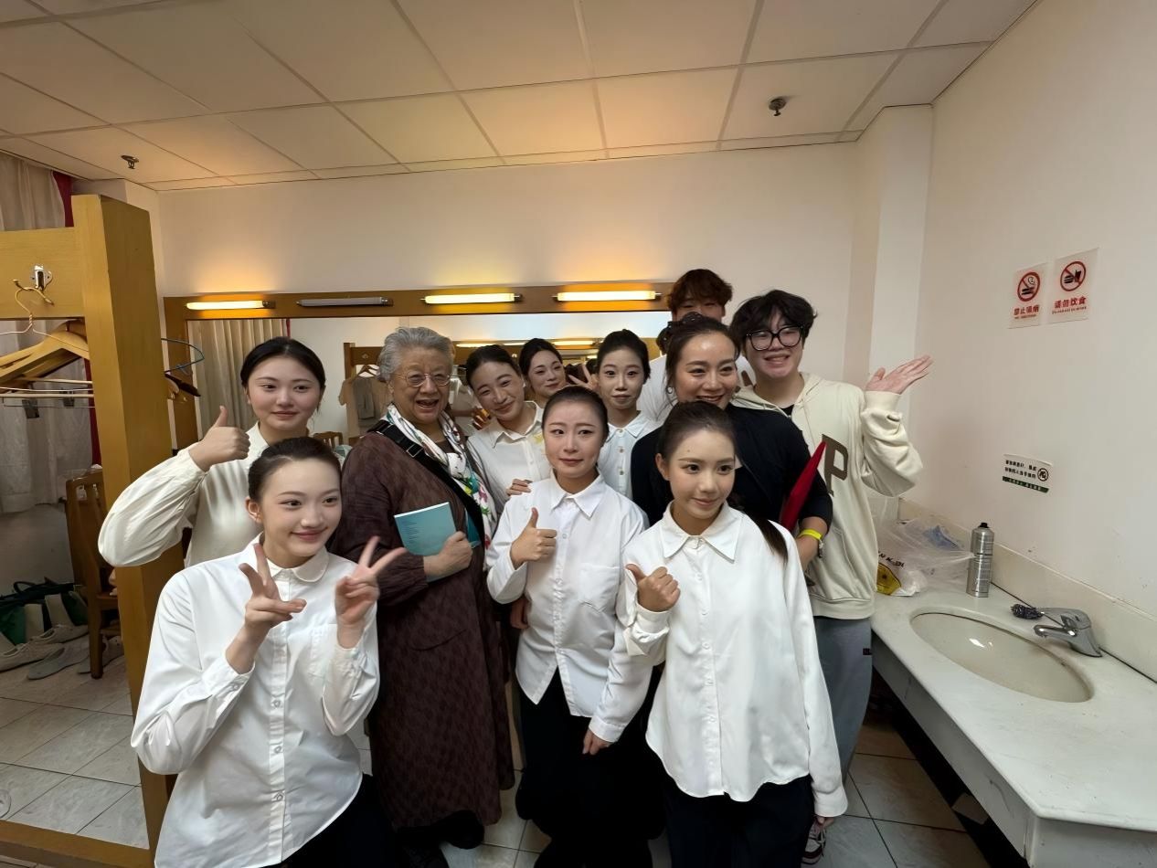 在杨悦君、赵桓两位表演老师与形体指导老师张程焱的精心指导下,演出当日,文淇、唐一等12名参演同学倾情演绎,将作品内涵精准呈现,赢得了现场观众的热烈反响。演出结束后,全总文工团原总团长、著名导演娄迺鸣专程来到后台,激动地称赞“演出太棒了”,并与剧组交流了创作心得。这份来自戏剧界前辈的认可与鼓励,让团队数月来的辛勤付出收获了珍贵回响。